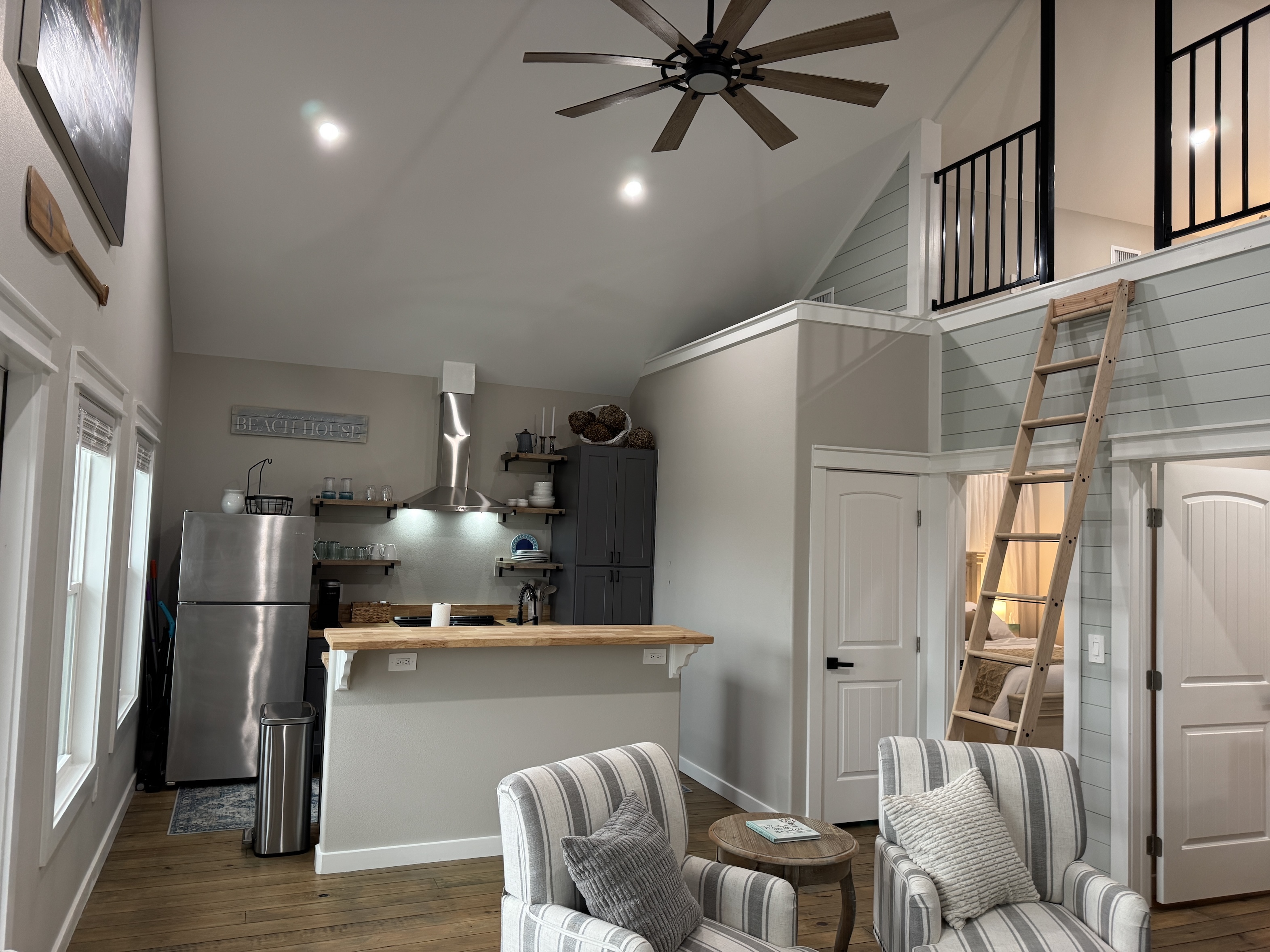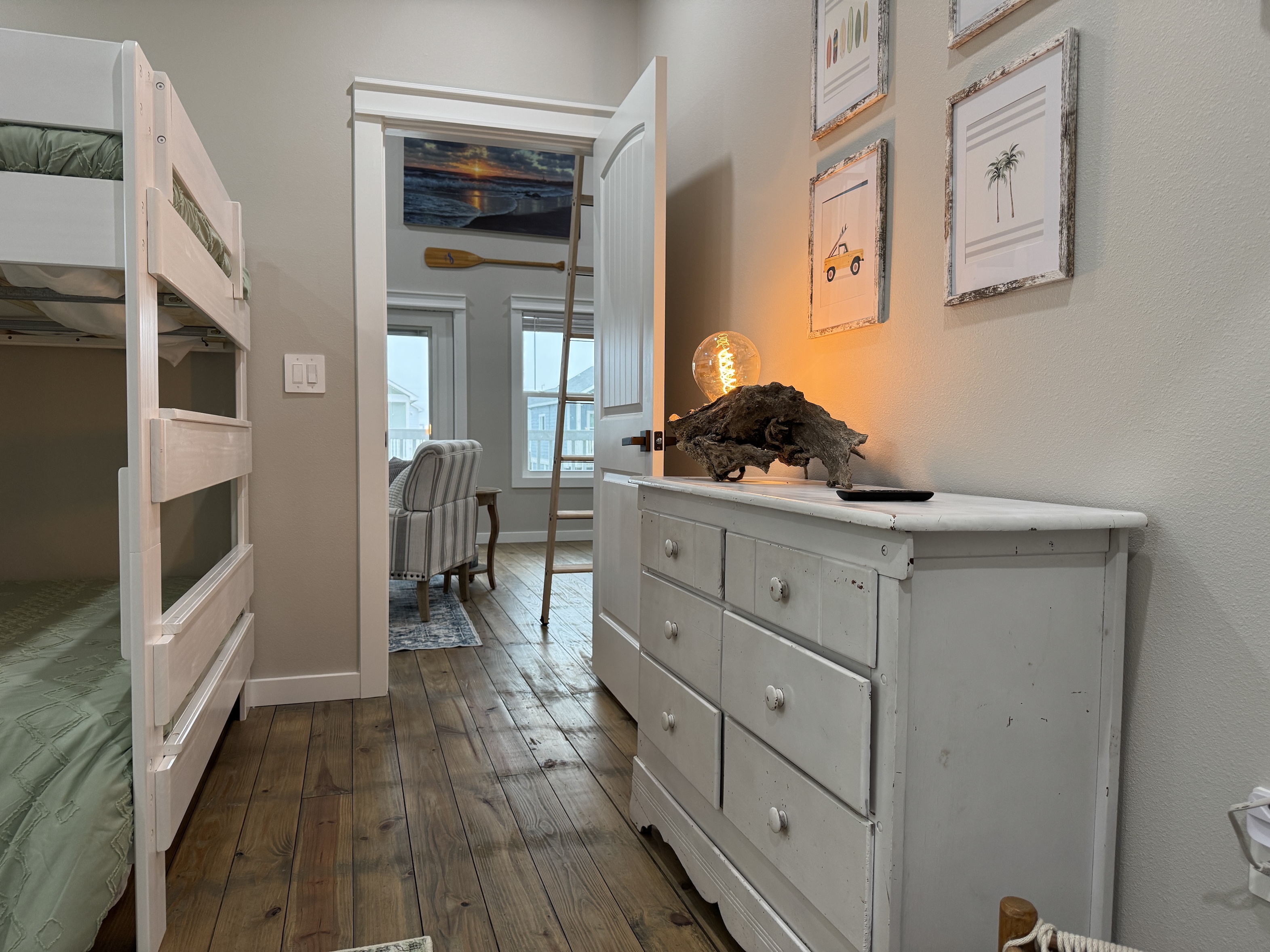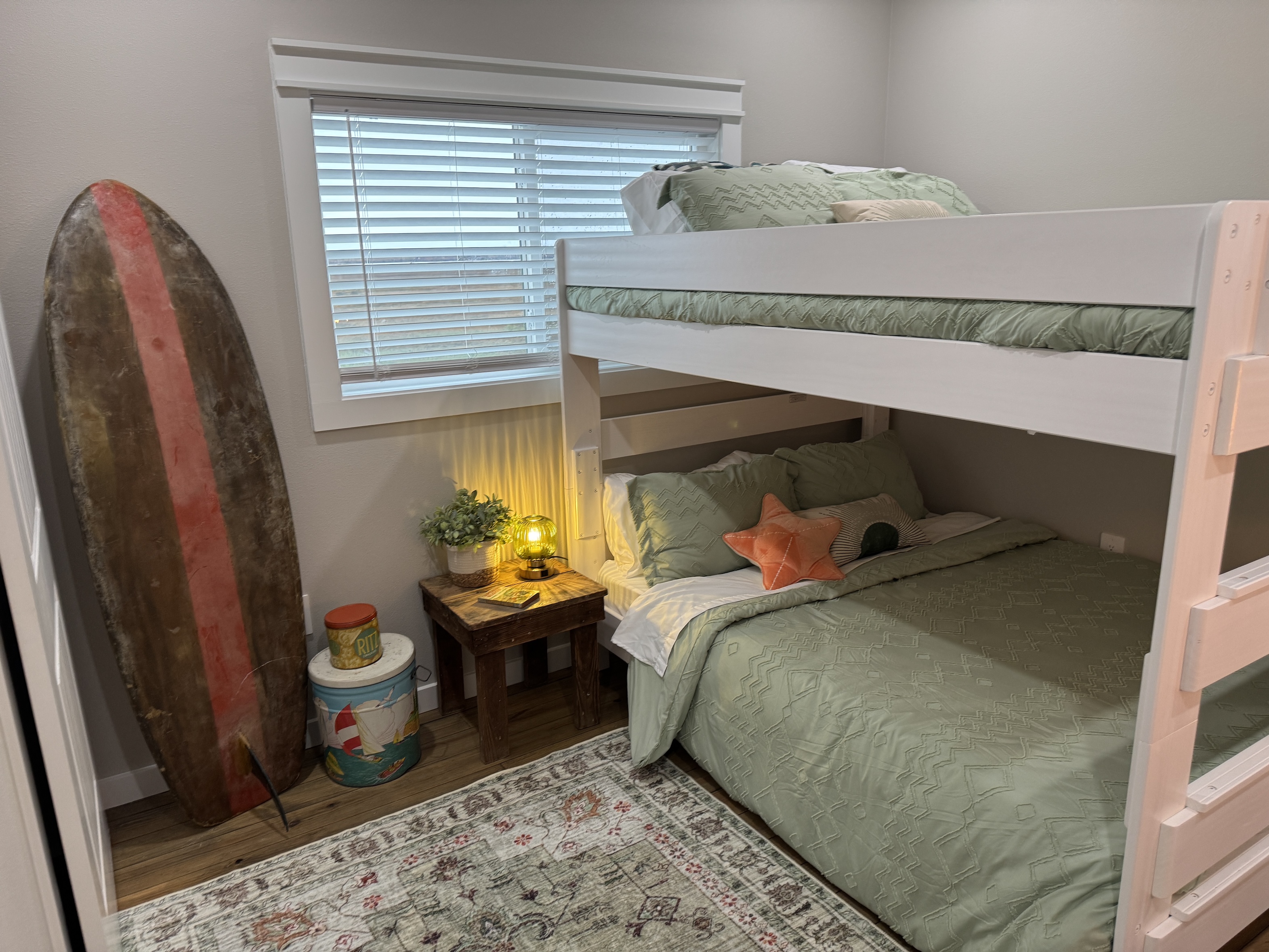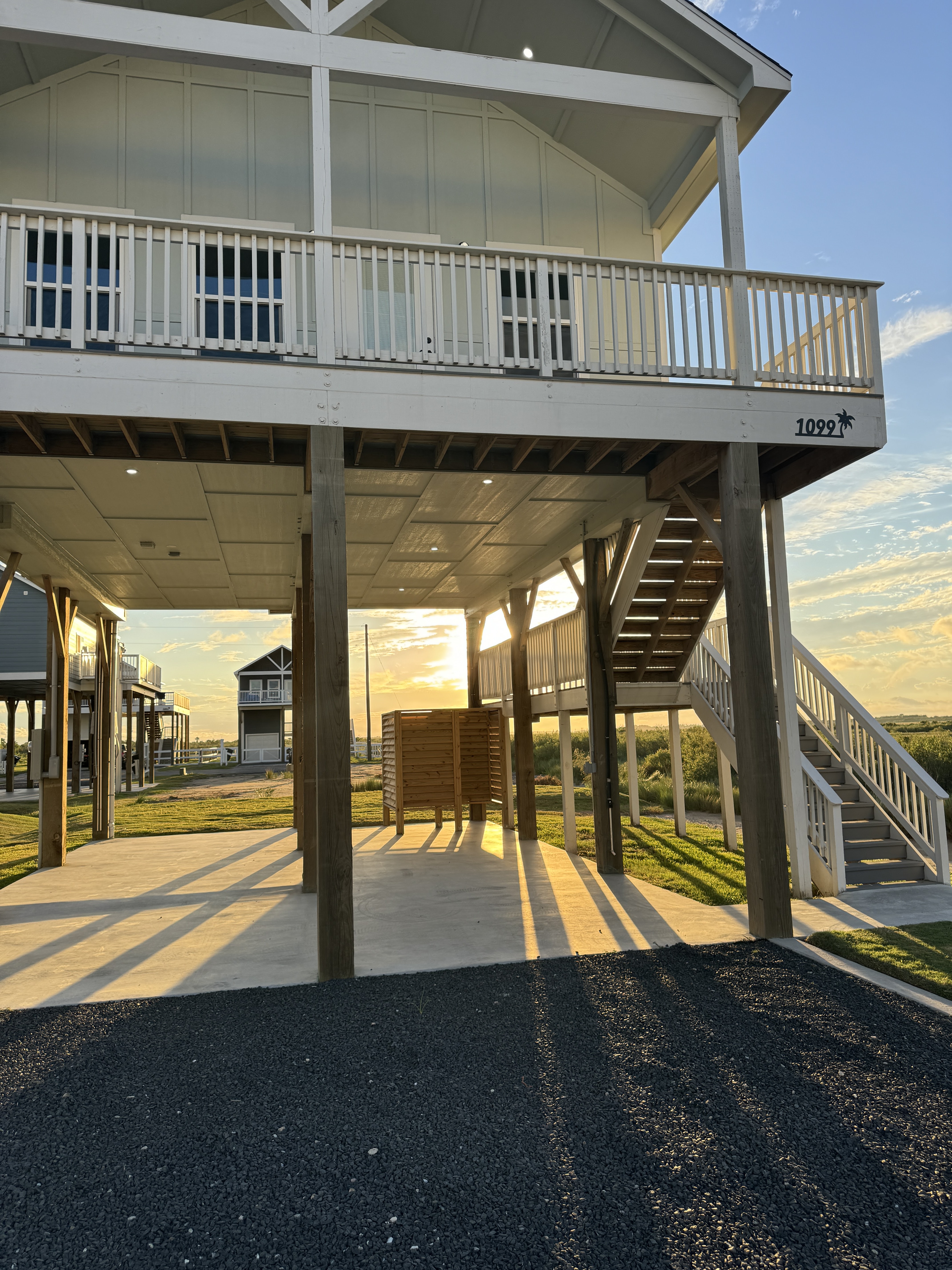 Upon arrival, you’ll be welcomed by a peaceful landscape just steps from the property. From the oversized back deck, enjoy sweeping views of the wetlands along the bayside of the peninsula — a prime spot for birdwatching along the Great Texas Coastal Birding Trail. You’ll also have a clear view of the intercoastal canal, where ships pass regularly. The sunsets from this deck are absolutely breathtaking — it’s the reason we fell in love with the home. Inside, a short flight of stairs leads to an open-concept living room and kitchen designed for connection. The oversized couch faces the bar and kitchen, making it easy to gather, cook, and relax together. A large wall-mounted TV with a swivel mount allows you to angle it however you like — perfect for movie nights or catching the game from anywhere in the room. This two-bedroom home comfortably sleeps six guests with three queen-size beds — one in the primary bedroom and two in a spacious bunk setup in the guest room. Each bedroom includes its own TV. The primary suite offers a cozy, romantic feel with soft, neutral tones, while the guest room adds a fun, beachy vibe with vintage touches like a 1970s surfboard and a unique tree-wood lamp. Both full bathrooms feature tub/shower combinations and spacious vanities. We provide body wash, shampoo, conditioner, Q-tips, cotton balls, face towels, and a hair dryer for your convenience. Above the bedrooms, you’ll find a loft space ideal for remote work or quiet reading, complete with a desk and a cozy vintage chair. Please note: the loft is accessed by a ladder that requires moderate agility. It is securely anchored but may not be suitable for elderly guests or those with mobility limitations. The property also includes a full RV hookup with direct sewer cleanout and both 3- and 4-prong electrical connections. Simply park alongside the garage on the concrete and gravel drive. This is perfect for larger gatherings (additional $50 per night — please let us know in advance if you plan to use it). Guests also have access to the neighborhood pool. The gate key (attached to a backscratcher so it doesn’t get misplaced!) is located in the kitchen cabinet next to the microwave. The beach is visible from the front door and just a five-minute walk or one-minute drive away. With a beach pass (available at local stores), you can park directly on the sand. Spend the day sunbathing, beachcombing, fishing, or even enjoying a beach fire when permitted. Whether you’re looking for adventure or a relaxing coastal escape, we hope you find everything you need at Jelly Bay.