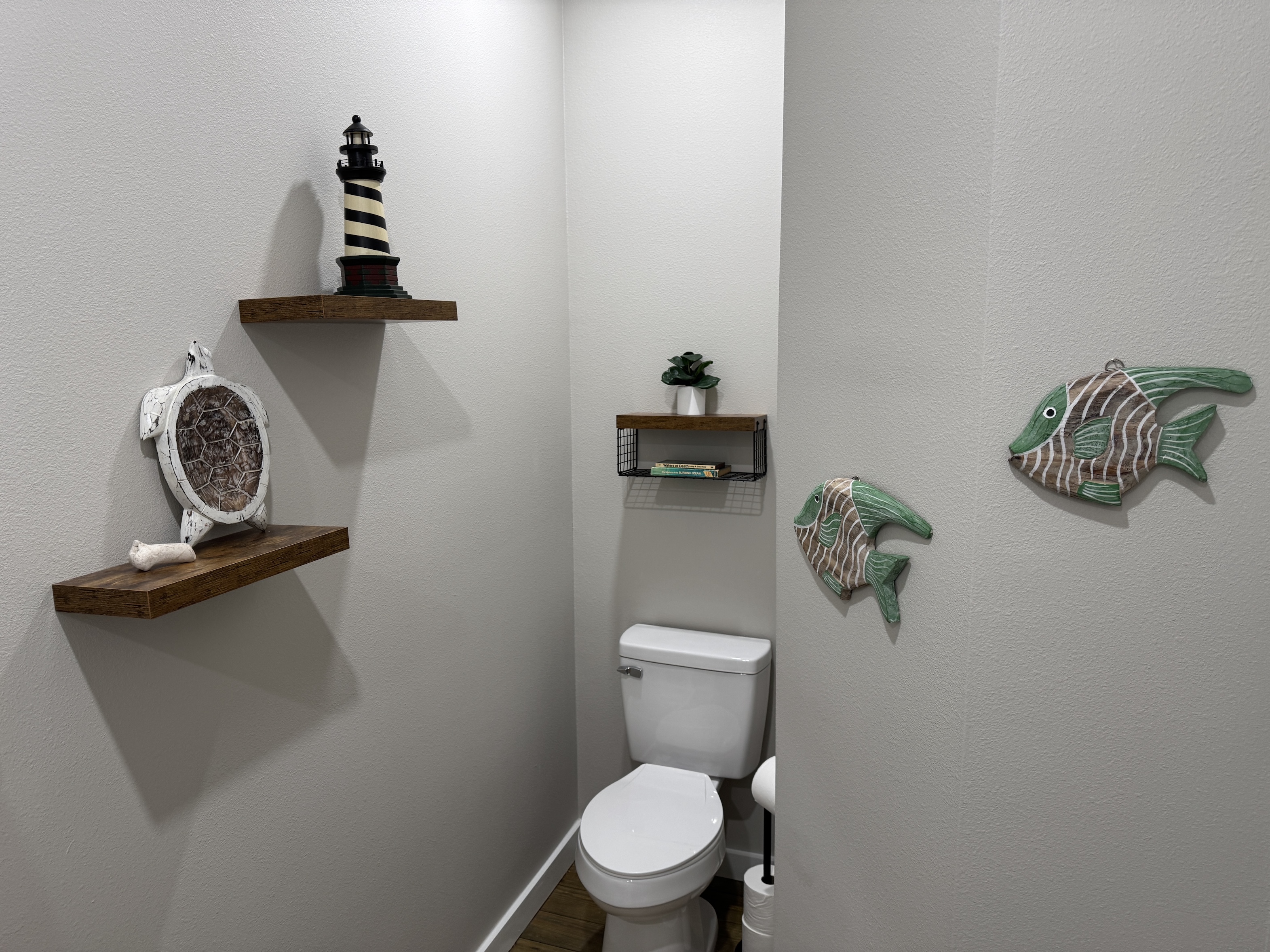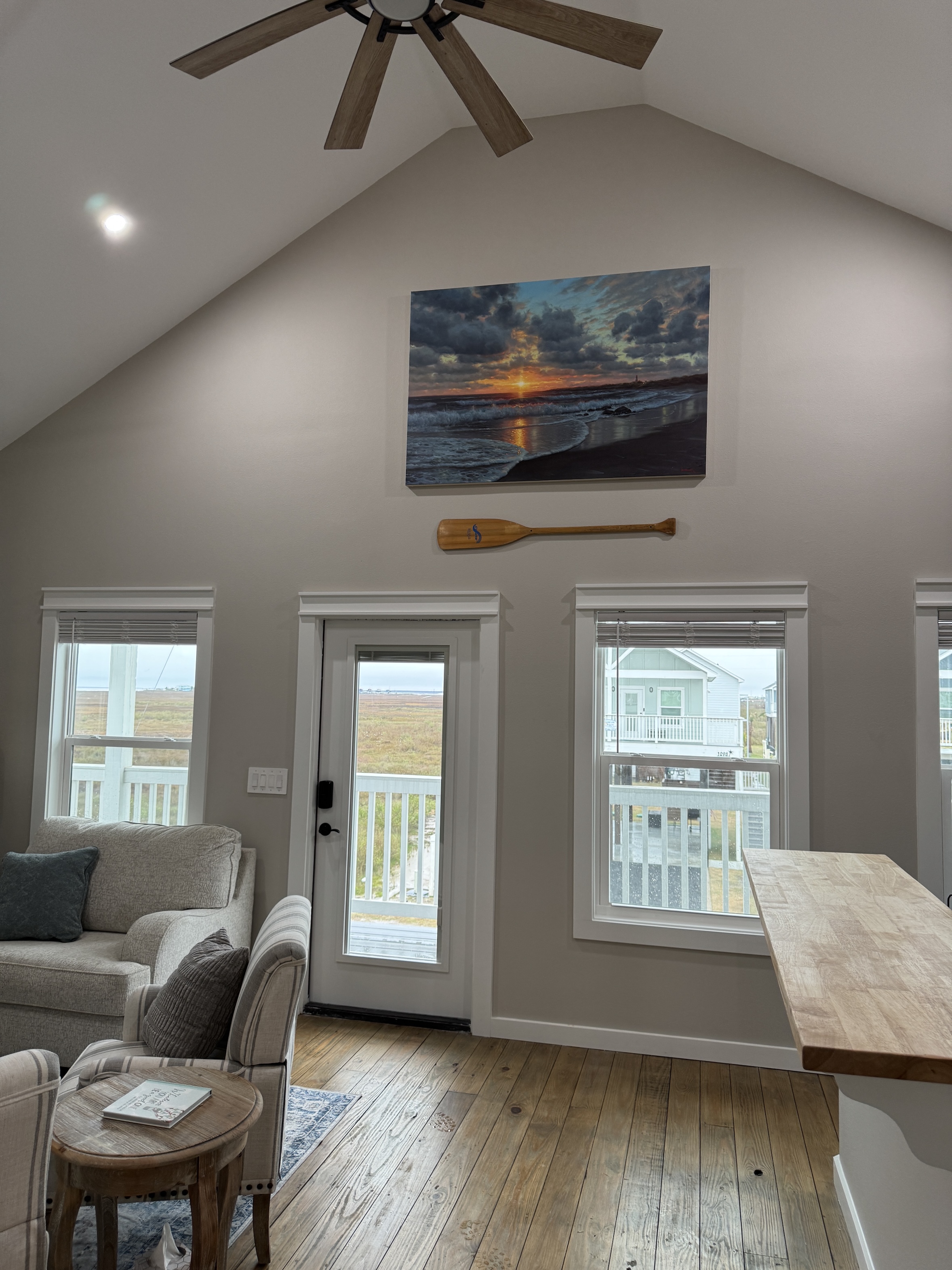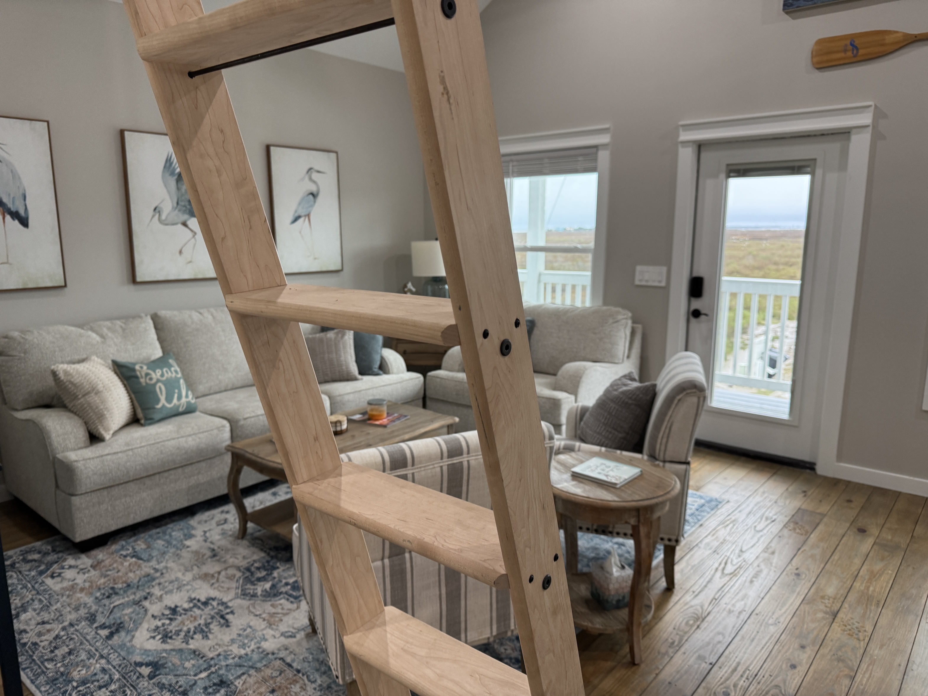 Upon arrival, you’ll be welcomed by a peaceful landscape just steps from the property. From the oversized back deck, enjoy sweeping views of the wetlands along the bayside of the peninsula — a prime spot for birdwatching along the Great Texas Coastal Birding Trail. You’ll also have a clear view of the intercoastal canal, where ships pass regularly. The sunsets from this deck are absolutely breathtaking — it’s the reason we fell in love with the home. Inside, a short flight of stairs leads to an open-concept living room and kitchen designed for connection. The oversized couch faces the bar and kitchen, making it easy to gather, cook, and relax together. A large wall-mounted TV with a swivel mount allows you to angle it however you like — perfect for movie nights or catching the game from anywhere in the room. This two-bedroom home comfortably sleeps six guests with three queen-size beds — one in the primary bedroom and two in a spacious bunk setup in the guest room. Each bedroom includes its own TV. The primary suite offers a cozy, romantic feel with soft, neutral tones, while the guest room adds a fun, beachy vibe with vintage touches like a 1970s surfboard and a unique tree-wood lamp. Both full bathrooms feature tub/shower combinations and spacious vanities. We provide body wash, shampoo, conditioner, Q-tips, cotton balls, face towels, and a hair dryer for your convenience. Above the bedrooms, you’ll find a loft space ideal for remote work or quiet reading, complete with a desk and a cozy vintage chair. Please note: the loft is accessed by a ladder that requires moderate agility. It is securely anchored but may not be suitable for elderly guests or those with mobility limitations. The property also includes a full RV hookup with direct sewer cleanout and both 3- and 4-prong electrical connections. Simply park alongside the garage on the concrete and gravel drive. This is perfect for larger gatherings (additional $50 per night — please let us know in advance if you plan to use it). Guests also have access to the neighborhood pool. The gate key (attached to a backscratcher so it doesn’t get misplaced!) is located in the kitchen cabinet next to the microwave. The beach is visible from the front door and just a five-minute walk or one-minute drive away. With a beach pass (available at local stores), you can park directly on the sand. Spend the day sunbathing, beachcombing, fishing, or even enjoying a beach fire when permitted. Whether you’re looking for adventure or a relaxing coastal escape, we hope you find everything you need at Jelly Bay.
