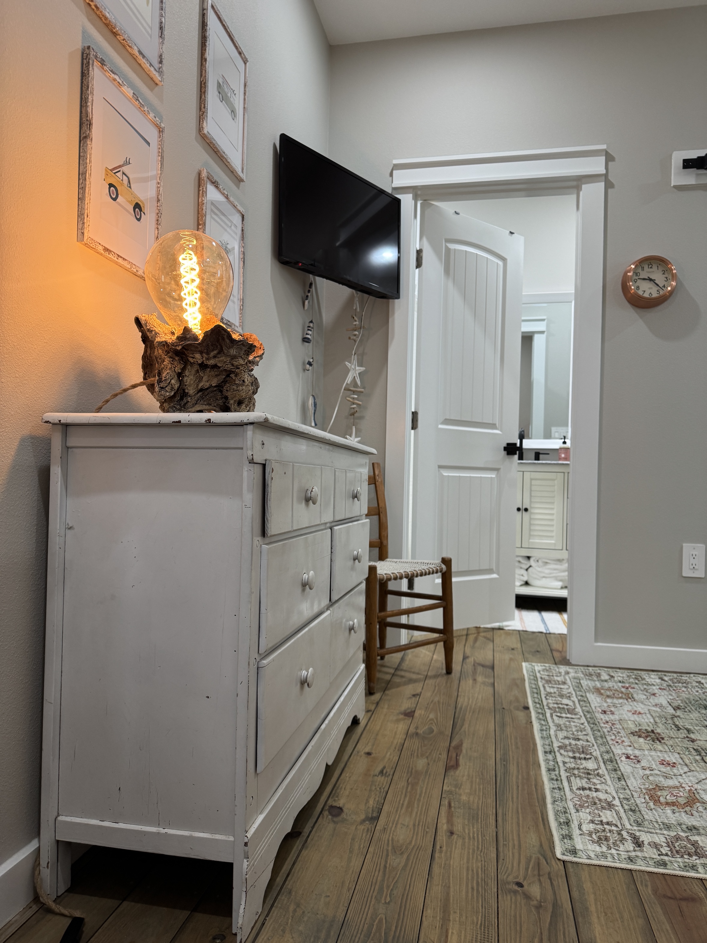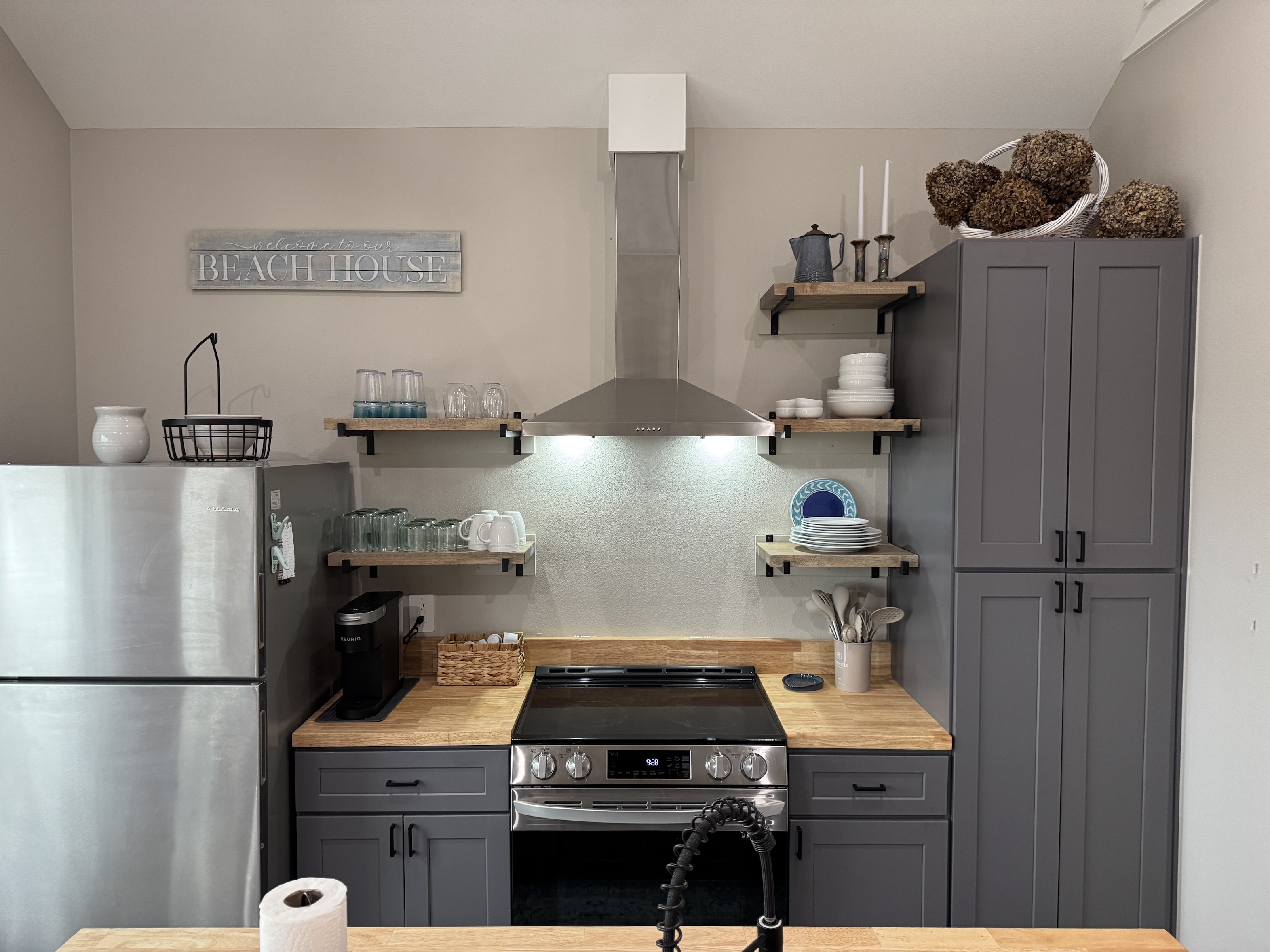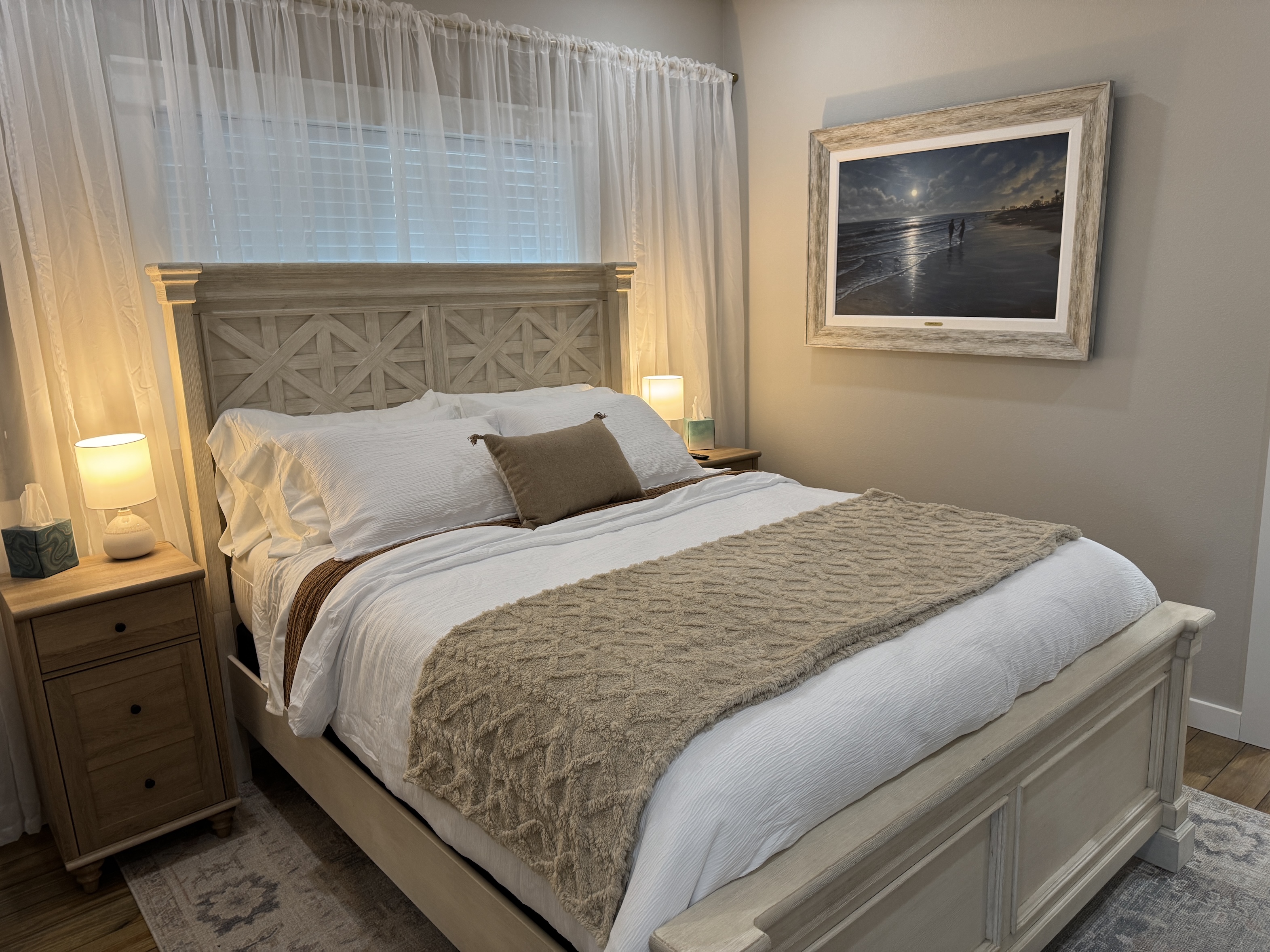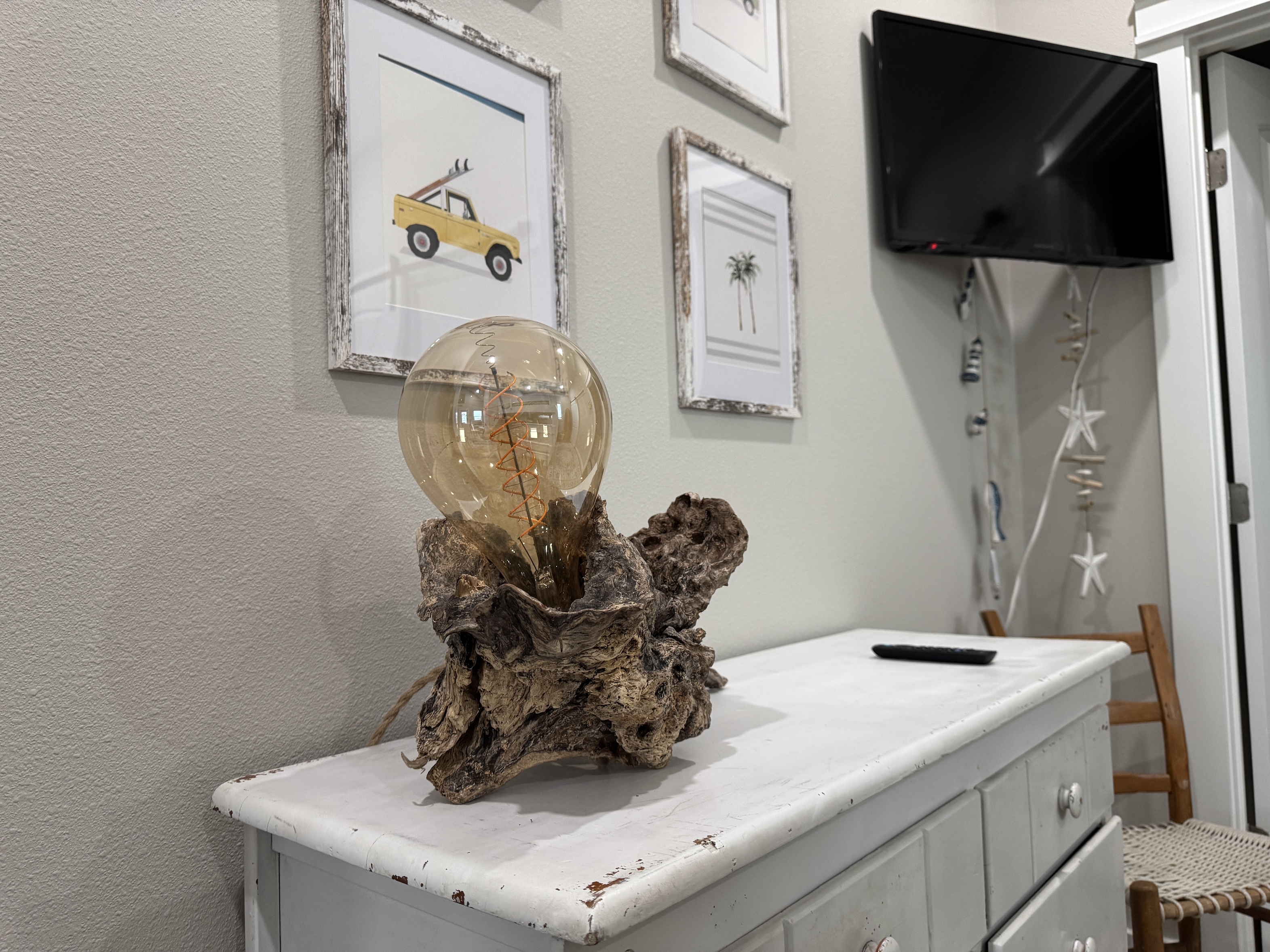 Upon arrival, you’ll be welcomed by a peaceful landscape just steps from the property. From the oversized back deck, enjoy sweeping views of the wetlands along the bayside of the peninsula — a prime spot for birdwatching along the Great Texas Coastal Birding Trail. You’ll also have a clear view of the intercoastal canal, where ships pass regularly. The sunsets from this deck are absolutely breathtaking — it’s the reason we fell in love with the home. Inside, a short flight of stairs leads to an open-concept living room and kitchen designed for connection. The oversized couch faces the bar and kitchen, making it easy to gather, cook, and relax together. A large wall-mounted TV with a swivel mount allows you to angle it however you like — perfect for movie nights or catching the game from anywhere in the room. This two-bedroom home comfortably sleeps six guests with three queen-size beds — one in the primary bedroom and two in a spacious bunk setup in the guest room. Each bedroom includes its own TV. The primary suite offers a cozy, romantic feel with soft, neutral tones, while the guest room adds a fun, beachy vibe with vintage touches like a 1970s surfboard and a unique tree-wood lamp. Both full bathrooms feature tub/shower combinations and spacious vanities. We provide body wash, shampoo, conditioner, Q-tips, cotton balls, face towels, and a hair dryer for your convenience. Above the bedrooms, you’ll find a loft space ideal for remote work or quiet reading, complete with a desk and a cozy vintage chair. Please note: the loft is accessed by a ladder that requires moderate agility. It is securely anchored but may not be suitable for elderly guests or those with mobility limitations. The property also includes a full RV hookup with direct sewer cleanout and both 3- and 4-prong electrical connections. Simply park alongside the garage on the concrete and gravel drive. This is perfect for larger gatherings (additional $50 per night — please let us know in advance if you plan to use it). Guests also have access to the neighborhood pool. The gate key (attached to a backscratcher so it doesn’t get misplaced!) is located in the kitchen cabinet next to the microwave. The beach is visible from the front door and just a five-minute walk or one-minute drive away. With a beach pass (available at local stores), you can park directly on the sand. Spend the day sunbathing, beachcombing, fishing, or even enjoying a beach fire when permitted. Whether you’re looking for adventure or a relaxing coastal escape, we hope you find everything you need at Jelly Bay.
